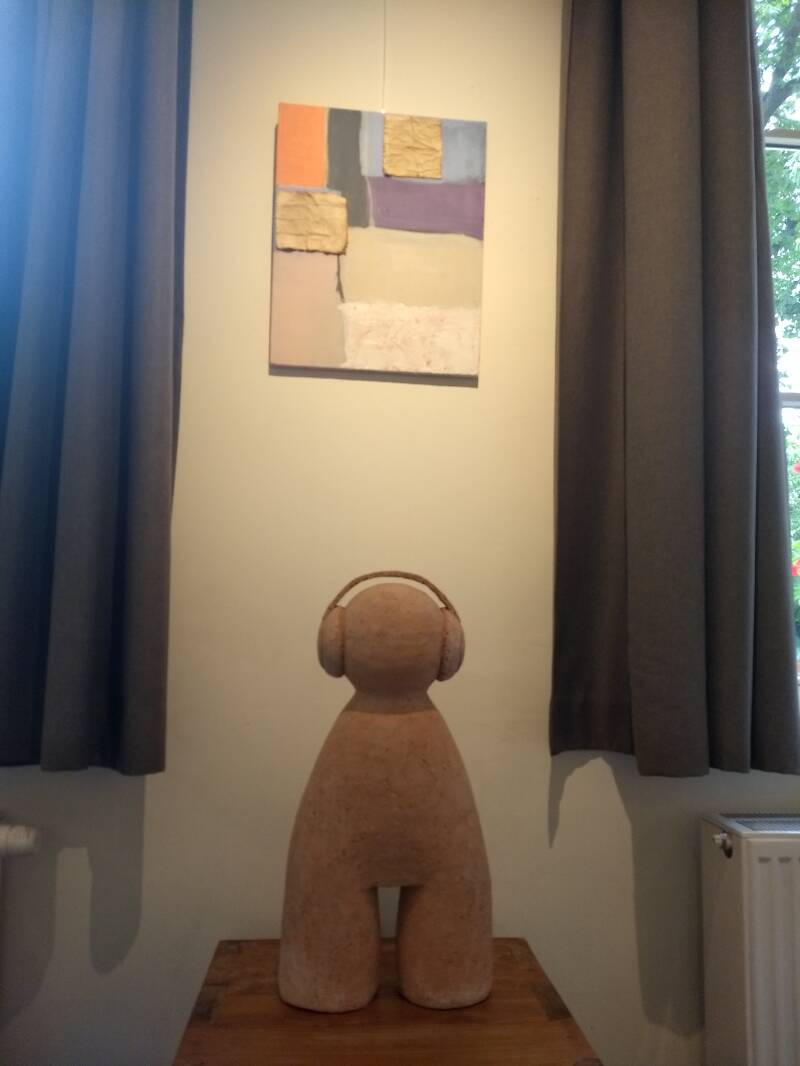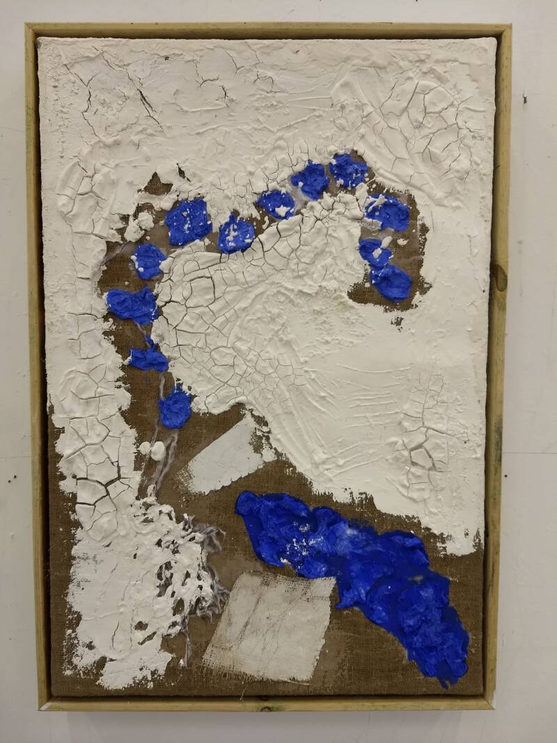 Gemengde technieken op jute doek 110 x 75 cm met kader in hout.